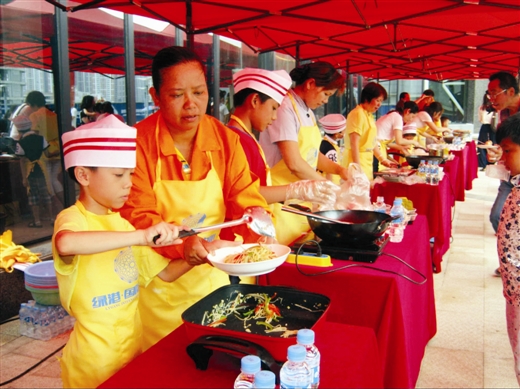 本報(bào)訊 昨日上午,南寧經(jīng)濟(jì)技術(shù)開(kāi)發(fā)區(qū)在綠港·國(guó)際中心開(kāi)展了以“關(guān)愛(ài)農(nóng)民工·綠港小廚神”親子活動(dòng),吸引了南寧經(jīng)開(kāi)區(qū)園林綠化工人、水電維修物業(yè)工人、保潔人員等300多名進(jìn)城務(wù)工人員及其子女參加。在活動(dòng)現(xiàn)場(chǎng),參賽小選手們?cè)诟改傅闹笇?dǎo)下井井有條地備菜、炒菜、起鍋,忙得不亦樂(lè)乎。