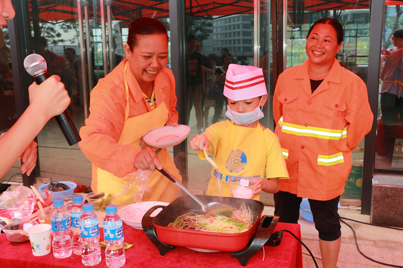搶答活動(dòng)結(jié)束之后,進(jìn)入“小廚神”廚藝大比拼環(huán)節(jié)。由園林綠化工人、水電維修物業(yè)工人、保潔人員等進(jìn)城務(wù)工人員組成的5組家庭展開了激烈的廚藝大比拼競賽??矗N神們在父母的指導(dǎo)下井井有條地備菜、炒菜、起鍋,忙得不亦樂乎。各色菜式色香味俱全,充分展現(xiàn)了孩子們“小當(dāng)家”的本領(lǐng)。半小時(shí)后,小廚神們在大家的熱烈掌聲中完成了比賽菜品,廚藝大師及現(xiàn)場觀眾根據(jù)完成的速度、菜品、味道等評出廚藝大賽一等獎(jiǎng)1名,二等獎(jiǎng)2名,三等獎(jiǎng)3名,優(yōu)秀獎(jiǎng)10名。