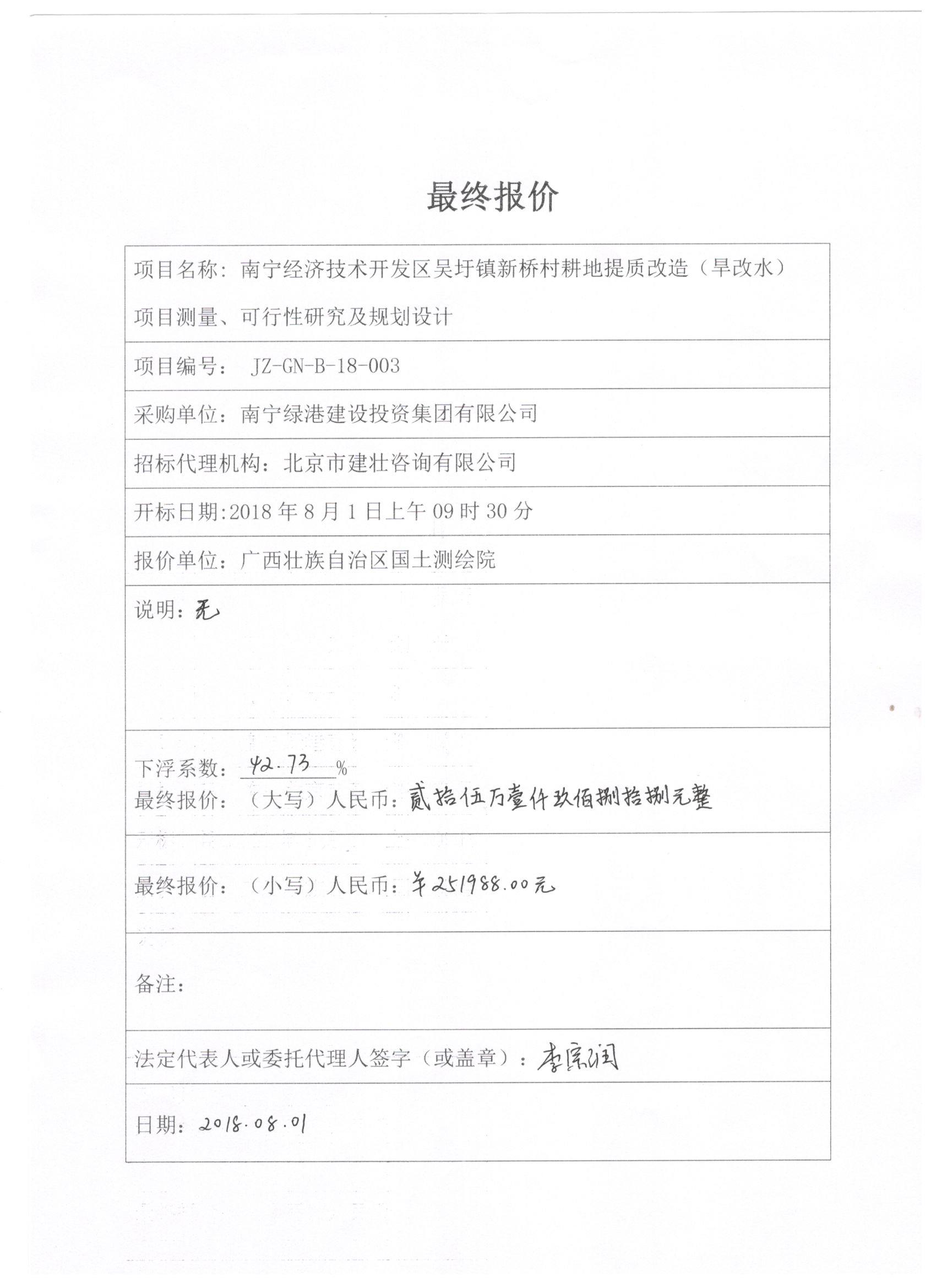 北京市建壯咨詢有限公司受南寧綠港建設(shè)投資集團(tuán)有限公司委托,根據(jù)《中華人民共和國(guó)政府采購(gòu)法》等有關(guān)規(guī)定,于2018年8月1日就南寧經(jīng)濟(jì)技術(shù)開發(fā)區(qū)吳圩鎮(zhèn)新橋村耕地提質(zhì)改造(旱改水)項(xiàng)目測(cè)量、可行性研究及規(guī)劃設(shè)計(jì)以競(jìng)爭(zhēng)性磋商方式進(jìn)行采購(gòu),現(xiàn)就本次采購(gòu)的成交結(jié)果公告如下: