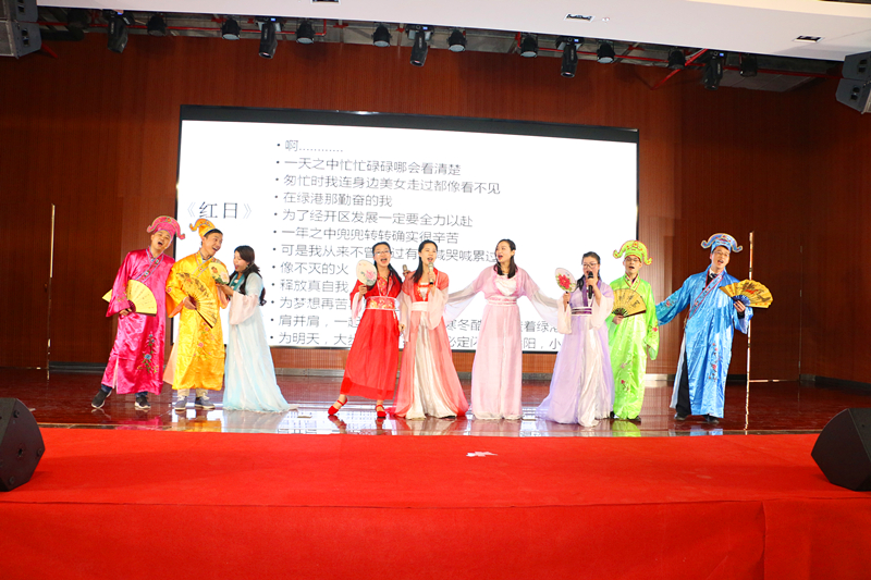 隨后,來自集團工程管理部林重胤以及嘉通公司潘青青甜蜜獻(xiàn)唱《告白氣球》,讓大家感受到了愛情的絲絲美好。嘉通公司的《夸夸咱公司》,用三句半的表演形式唱出了綠港集團濃濃的企業(yè)文化情愫,也展現(xiàn)了綠港員工積極、拼搏、向上的精神?!段乙鼐G港》、《聲臨其境》、《好運來》、《愛》、《好嗨喲》等多個節(jié)目在觀眾的熱情掌聲中聯(lián)袂奉上一場精彩演出,整個活動歌聲笑聲、熱烈的掌聲匯成了歡樂的海洋。集團營銷管理中心的《四小天王齊賀歲》以及集團計劃運營部、紀(jì)檢監(jiān)察審計部、安全監(jiān)督部聯(lián)合帶來的《蒙面唱將猜猜猜》將活動推向高潮,現(xiàn)場掌聲不斷??彀濉毒G港贊歌》道出了綠港集團成立五載,綠港人用智慧和汗水所取得的成效。最后,集團領(lǐng)導(dǎo)班子壓軸出場,帶來詩歌朗誦《相信未來》,贏得陣陣掌聲,讓大家堅定了信心、鼓足了干勁,對美好生活更加熱愛和向往。