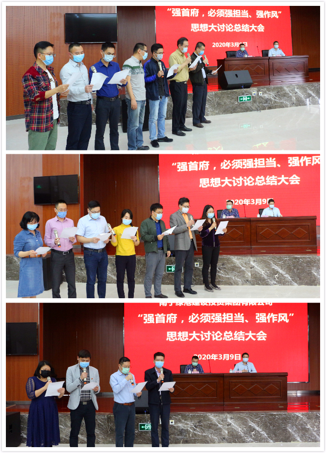 最后,集團(tuán)黨委書(shū)記、董事長(zhǎng)龔國(guó)強(qiáng)對(duì)本次思想大討論活動(dòng)開(kāi)展情況進(jìn)行了總結(jié)點(diǎn)評(píng),并要求各部門(mén)、各子公司認(rèn)真踐行諾言,落實(shí)落細(xì)措施,確保取得良好成效。龔書(shū)記表示,當(dāng)前疫情形勢(shì)依然嚴(yán)峻復(fù)雜,全國(guó)各地都在做好疫情防控的前提下,出臺(tái)了一系列政策措施,搶開(kāi)局、穩(wěn)經(jīng)濟(jì)、促發(fā)展。綠港集團(tuán)在疫情防控的關(guān)鍵時(shí)刻召開(kāi)這次總結(jié)會(huì),就是要進(jìn)一步營(yíng)造一心一意謀發(fā)展的濃厚氛圍,形成全力以赴落實(shí)強(qiáng)首府戰(zhàn)略的強(qiáng)烈共識(shí),傳遞出疫情防控和經(jīng)濟(jì)發(fā)展兩手抓、兩手都要硬的鮮明導(dǎo)向和強(qiáng)烈信號(hào),為實(shí)現(xiàn)集團(tuán)公司高質(zhì)量發(fā)展的“加速度”,全力以赴完成好新的一年集團(tuán)公司的各項(xiàng)發(fā)展任務(wù)目標(biāo)。作為經(jīng)開(kāi)區(qū)最大的平臺(tái)公司,2020年年初以來(lái),綠港集團(tuán)緊緊圍繞“強(qiáng)首府,必須強(qiáng)擔(dān)當(dāng)、強(qiáng)作風(fēng)”的總體要求,著重在“學(xué)精神、查不足、求改變、強(qiáng)擔(dān)當(dāng)”上下功夫,針對(duì)如何解決六個(gè)方面突出問(wèn)題、如何克服十種突出現(xiàn)象以及如何在八種情形下運(yùn)用容錯(cuò)糾錯(cuò)機(jī)制,結(jié)合工作實(shí)際,群策群力開(kāi)展了三次專(zhuān)題思想大討論活動(dòng),通過(guò)查深、查透、立行立改,有力轉(zhuǎn)變了作風(fēng),進(jìn)一步提高了干部職工的緊迫感、使命感,為全面落實(shí)強(qiáng)首府戰(zhàn)略,奮力譜寫(xiě)集團(tuán)公司高質(zhì)量發(fā)展新篇章凝聚了共識(shí),集聚了動(dòng)力。
