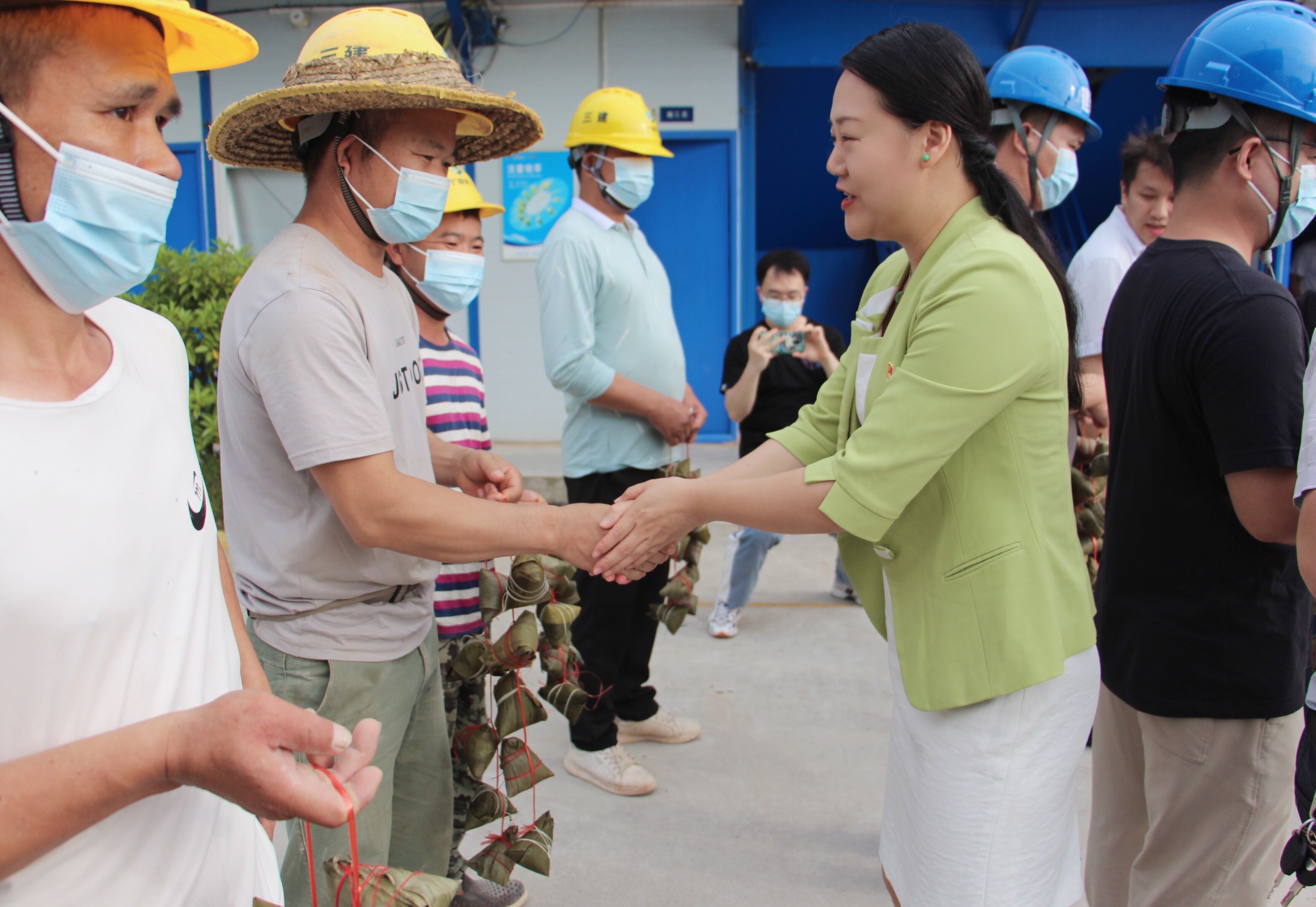 關(guān)心關(guān)懷進(jìn)工地,濃濃粽情暖人心。座談會后,此次聯(lián)建的各黨支部相關(guān)領(lǐng)導(dǎo)共同慰問了項(xiàng)目一線工人,為他們送去粽子等慰問品和最真摯的節(jié)日問候,感謝一線工人的辛勤勞動(dòng)、敬業(yè)付出以及為綠港?金陽產(chǎn)業(yè)城等南寧市重點(diǎn)項(xiàng)目建設(shè)做出的貢獻(xiàn)。慰問中,綠港集團(tuán)黨委委員、副總經(jīng)理黃麗琴關(guān)切地詢問現(xiàn)場工人勞動(dòng)安全保障情況和防疫情況,叮囑大家要注意勞動(dòng)安全,防疫安全,堅(jiān)持安全與生產(chǎn)兩手抓兩不誤,希望大家繼續(xù)保持昂揚(yáng)的斗志,以高度的責(zé)任感和飽滿的工作熱情投身到項(xiàng)目建設(shè)中,為經(jīng)開區(qū)社會經(jīng)濟(jì)高質(zhì)量發(fā)展作出貢獻(xiàn)。