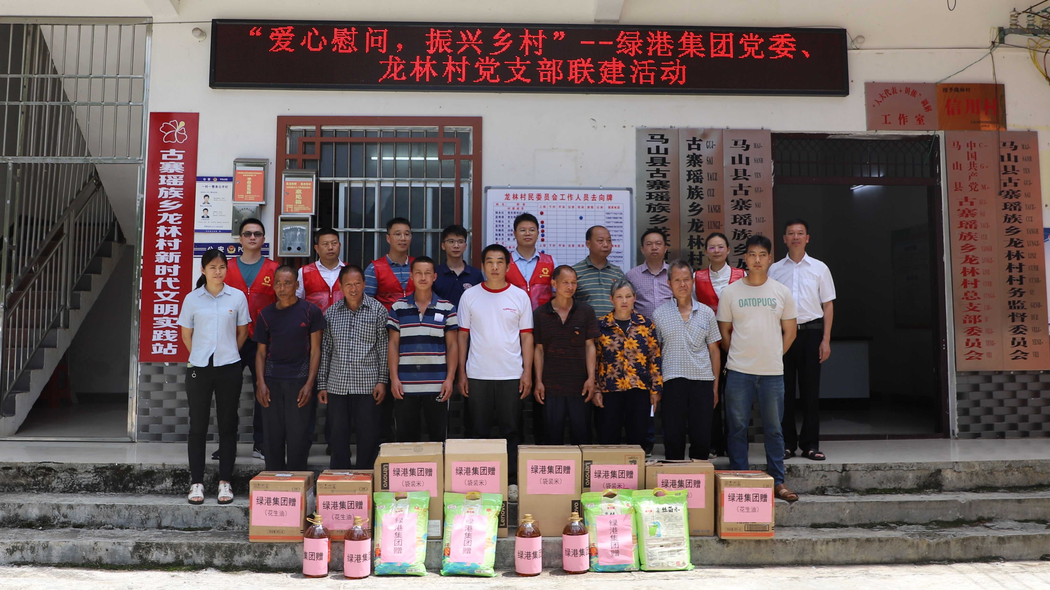 5月29日,綠港集團(tuán)黨委副書記、總經(jīng)理鄧?yán)^慧,黨委委員、副總經(jīng)理陸羿冰,黨委委員、副總經(jīng)理陽正輝,以及集團(tuán)黨委辦和萬方公司黨支部的部分同志代表集團(tuán)黨委,到對口幫扶的馬山縣古寨瑤族鄉(xiāng)龍林村開展村企聯(lián)建慰問活動。綠港集團(tuán)派駐龍林村第一書記梁華以及龍林村干部、駐村工作隊員一起參加了活動。
