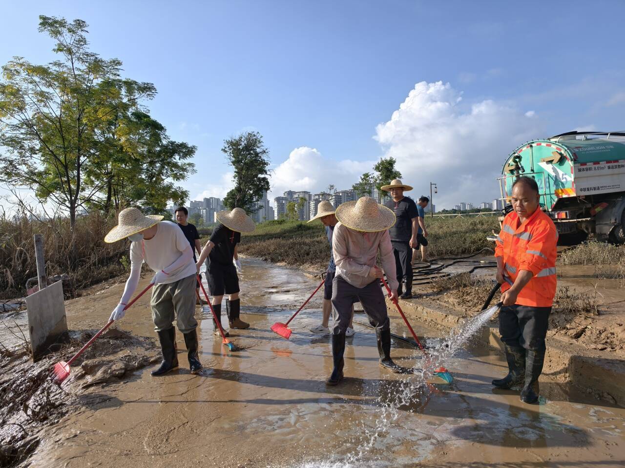 上午8點,志愿者們攜帶鐵鏟、刮泥板、掃帚、垃圾袋等工具,準(zhǔn)時在指定區(qū)域集合?,F(xiàn)場的淤泥最深處達(dá)10余厘米,腳一踩便陷進(jìn)去難以拔出,鏟子剛插進(jìn)泥里就被牢牢黏住?!按蠹曳止じ?,先刮表層泥,再清垃圾!” 隨著一聲號召,志愿者們迅速分組行動:有的彎腰緊握刮泥板,順著步道紋理反復(fù)刮除黏連的淤泥;有的扛著水管,利用高壓水槍沖刷地面;有的拎著垃圾袋,蹲下身細(xì)致?lián)焓安卦诓菘p里的垃圾;有的則推著清運車,來回穿梭將裝滿淤泥和垃圾的袋子及時運離現(xiàn)場…… 各個環(huán)節(jié)銜接緊密、井然有序。盡管天氣炎熱,汗水順著臉頰滑落、浸透衣衫,志愿者們的熱情與干勁絲毫未減,充分展現(xiàn)了國企的責(zé)任與擔(dān)當(dāng)。
